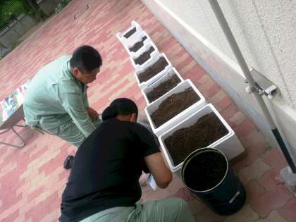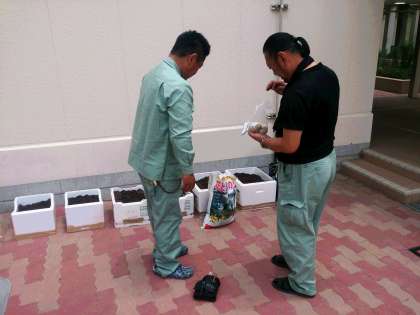 管理作業員さんが、サトイモの植え付けをしています。収穫は、秋になります。