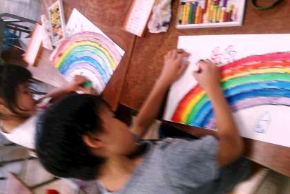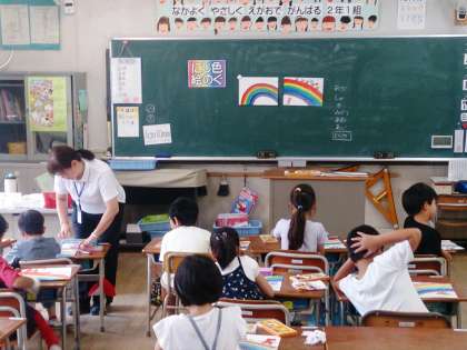 2年生は、図工の学習で、「にじ色えのぐ」に取り組んでいます。7つの色を工夫して、描画しています。