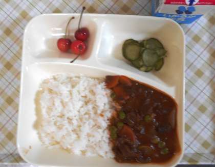 今日の給食は、ハヤシライス、キュウリのサラダ、サクランボ、ごはん、牛乳です。