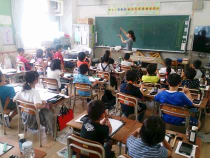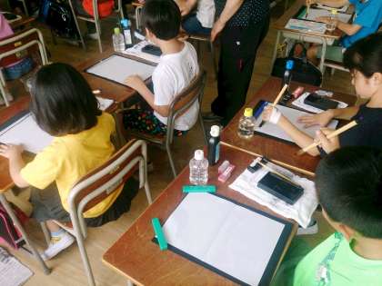 3年生は、国語の書写の学習に取り組んでいます。筆の使い方を練習しています。子どもたちの表情は、真剣そのものです。姿勢を正しく筆をたてに持ち、習字の基本を学んでいます。
