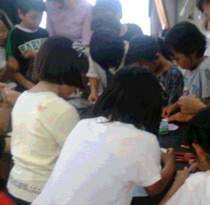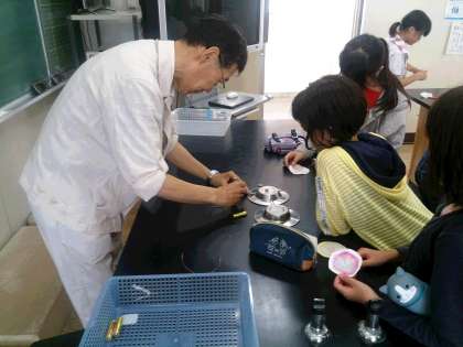 写真は、子ともたちにアドバイスしている理科支援員さんです。
