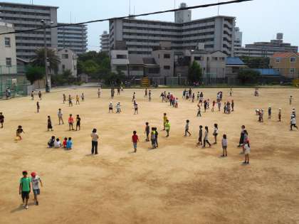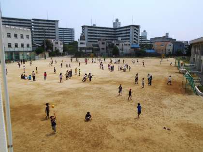 昼休み、今日もたくさんの子どもたちが運動場で遊んでいます。学級遊びで、先生方も一緒にいます。井高野小学校の子どもたちは、本当に元気いっぱいです。