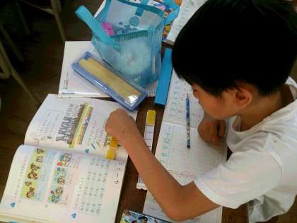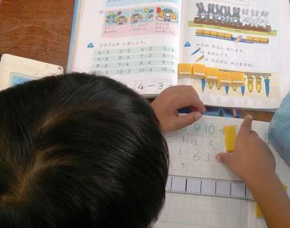 1年生では、現在、算数のひき算の学習を学んでいます。まず、具体物も活用し、課題解決に向けて取り組んでいます。