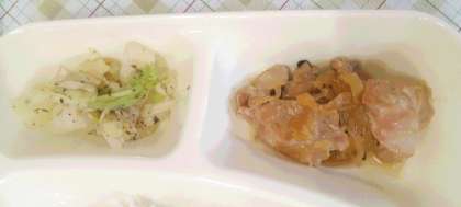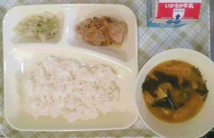 今日の給食は、鶏肉の甘辛焼き、味噌汁、キャベツのあかじそあえ、ごはん、牛乳です。