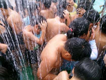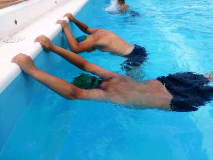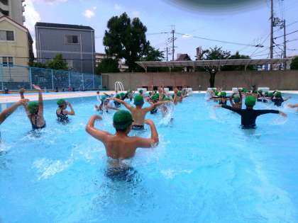 2年生のプール学習では、「浮く」練習をプールサイドの壁を使って、バディ(二人組)で、お互いのよかったところを伝えながらの練習に取り組んでいます。