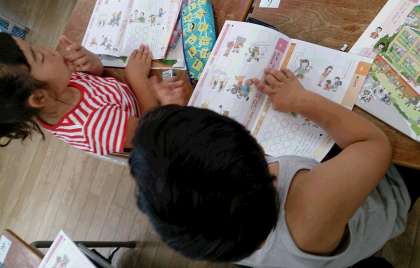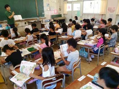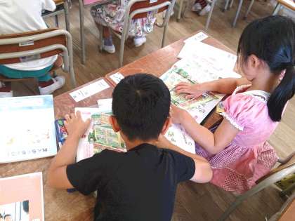 1年生の道徳では、「なにをしているのかな」という教材で、よいこと悪いについて考える学習に取り組んでいます。友だち二人で話し合う様子も見られました。