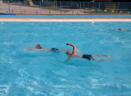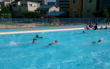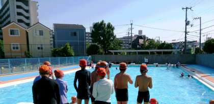 6年生の水泳学習では、長い距離を泳ぐ目標を立てて練習しています。プールの縦、25メートルを使って、子どもたちは熱心にそれぞれの記録を目指し頑張っています。