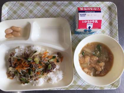 今日の給食は、牛丼、とうがんのみそ汁、大福豆の煮もの、ごはん、牛乳です。