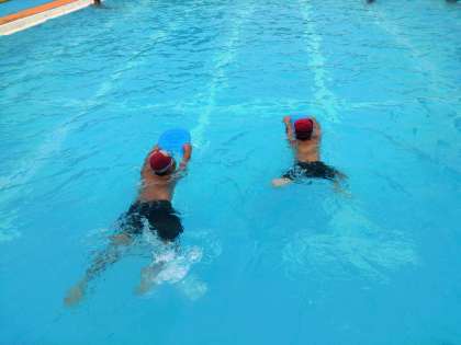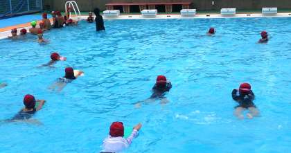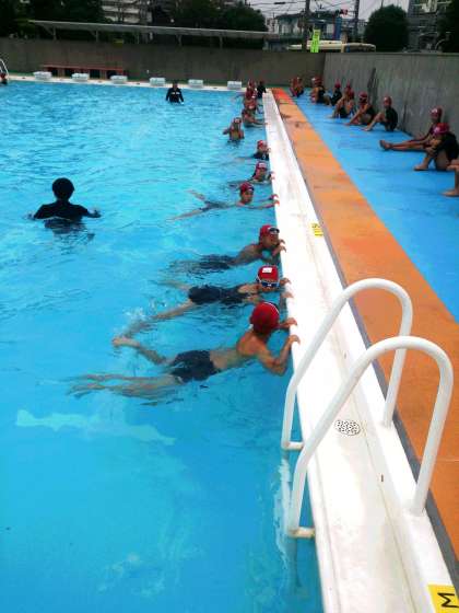 今日の1限目に、5年生の水泳学習がありました。写真は、平泳ぎの足の使い方を練習している様子です。平泳ぎは、泳法として難しい課題ですが、子どもたちは、とても頑張っています。