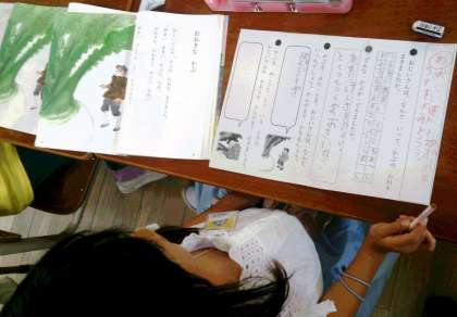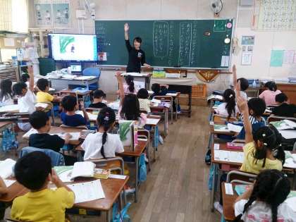 1年生の国語では、物語文「大きなかぶ」の学習に取り組んでいます。子どもたちは、ワークシートに読み取った考えを書いています。発表も元気いっぱいです。