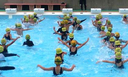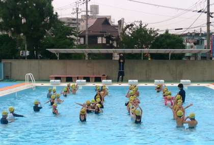 3限目は、1年生のプールです。音楽に合わせて動作をします。子どもたちは、動作も覚えて、リズムに乗って楽しく水慣れをしています。