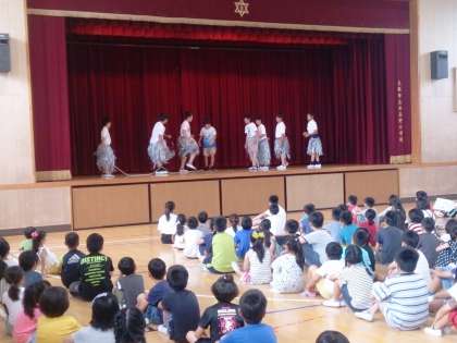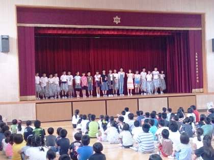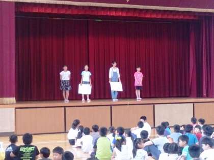 今朝の児童集会は、代表委員会の子どもたちが、「いじめについて考える」というテーマで、劇を演じました。最後に、いじめはぜったいしてはいけないというメッセージを子どもたちに伝えました。
