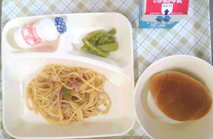今日の給食は、ポークトマトスパゲッティ、グリーンアスパラガスのサラダ、発酵乳、パン、牛乳です。