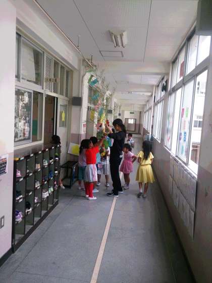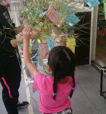 1年生が、七夕の短冊に願いごとを書いて、笹につけています。