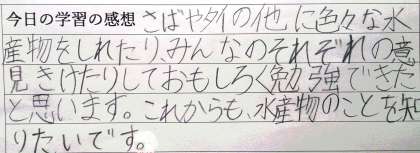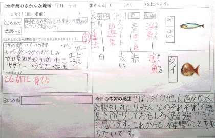 昨日の5年生社会「水産業のさかんな地域」の授業後の子どもたちのワークシートと感想です。子どもたちは、授業にとても集中して取り組めていました。感想もしっかり書けていました。