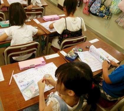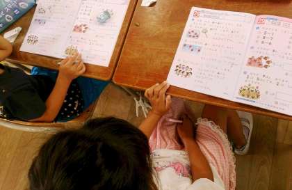 1年生の算数では、ドリルを使って「もんだいづくり」に取り組んでいます。子どもたちは、先生に質問したり、自分でいろいろな言葉をつぶやいたりしながら課題に取り組んでいます。