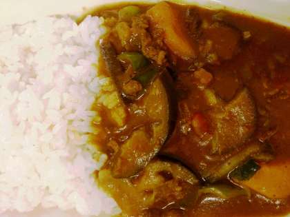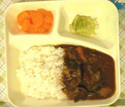 今日の給食は、夏野菜のカレーライス、キャベツのサラダ、ミカン、牛乳です。
