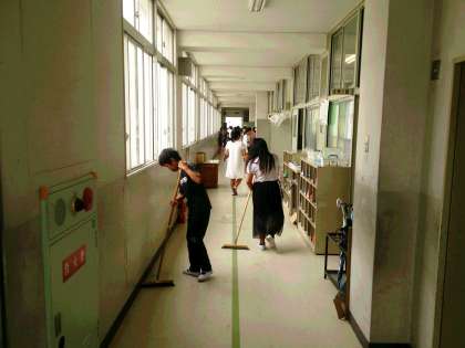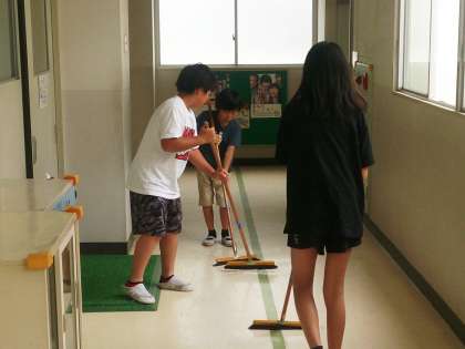 写真は、学校をきれいにするために、子どもたちが清掃活動をしている様子です。どの学年の子どもたちもいろいろな場所で、頑張って掃除に取り組んでいます。