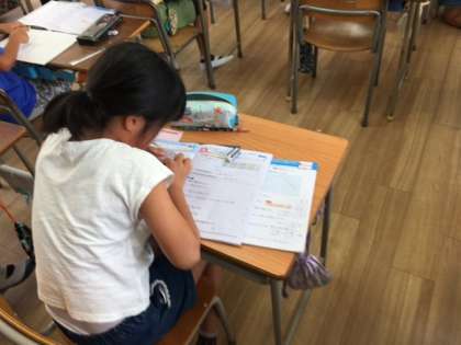 4年生は、ワークを使って1学期の復習を行っていました。わり算の筆算や分度器を使って角度を測るなど、段々と学習内容も難しくなってきております。