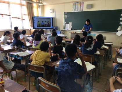 5年生は「立場を決めて討論しよう」という単元で、討論(ディベート)とはどのように行われるのか、見本映像を見て学んでいました。