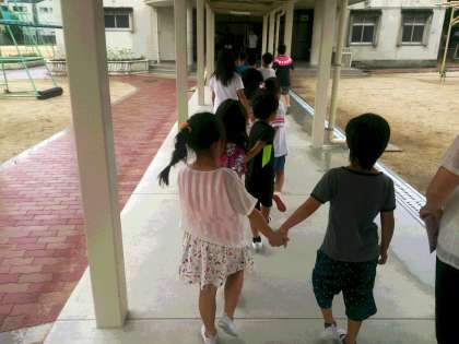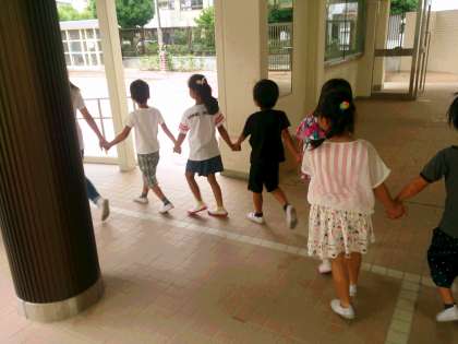 児童集会の集合等は、縦割り班で行います。今日も6年生が下級生の子どもたちを連れて集合していました。写真は、その手をつないだ微笑ましい様子です。