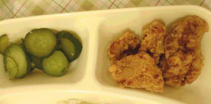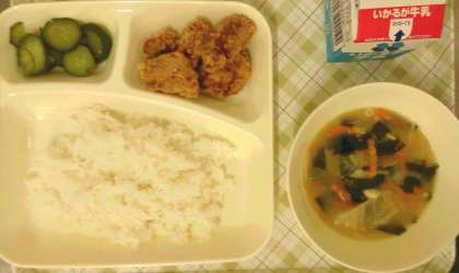 今日の給食は、豚肉のこうみあげ、味噌汁、キュウリの甘酢づけ、ごはん、牛乳です。