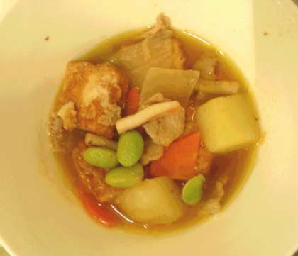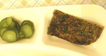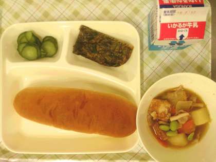 今日の給食は、モズク入りヒラヤーチ、豚肉とイカの煮物、あっさりキュウリ、パン、牛乳です。