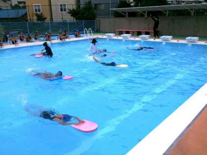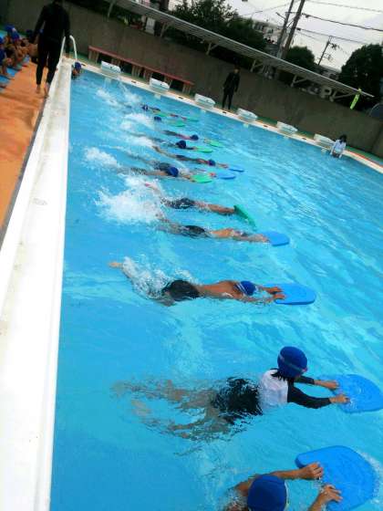 3年生では、プール学習で、クロールの泳法練習にとりくんでいます。ビート板を使い、特に息つぎに気をつけて練習しています。