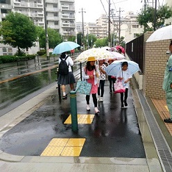 今日は、あいにくの雨中の登校となりましたが、子どもたちは、しっかりと朝の挨拶をして、元気に登校できています。
