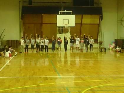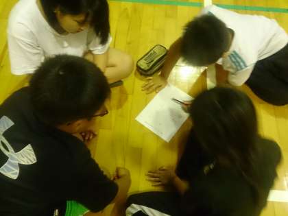 室内オリンピックで、開会式から作戦会議、風船槍投げの様子です。