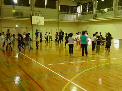少し早めの下山だったので、体育館で、班遊びをしています。写真は、風船バレーを楽しんでいる様子です。