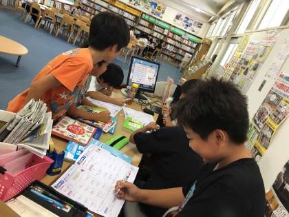 26日(金)までと8月2日、9日、23日は図書館開放をしております。図書委員の児童も当番の仕事をしながら宿題もがんばっていました。