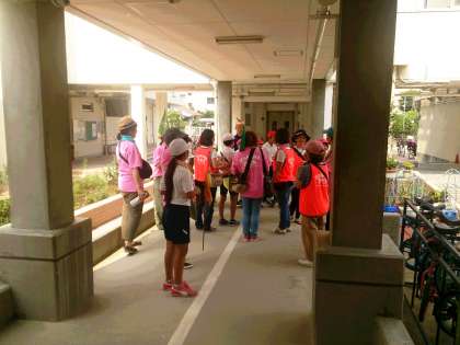 グループゲームで、校舎内をチームで回っています。ジャンケンに勝って、箱からカードをひいています。