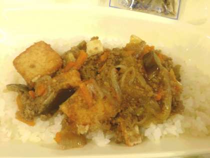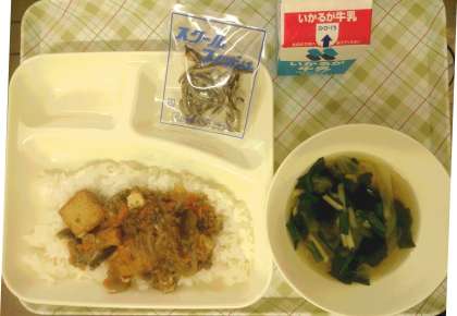 今日の給食は、マーボーあつあげ丼、中華スープ、ミニフィッシュ、ごはん、牛乳です。