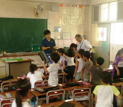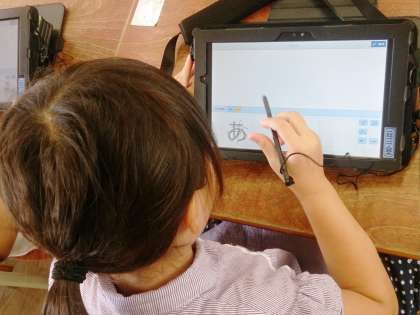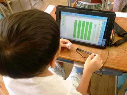 1年生の生活科では、タブレットの手書き入力で、「あのつく言葉」を書き入れました。今日は、ICT支援員さんの支援や教育センターの指導員さんも学習の様子を見に来られました。子どもたち全員、しっかりと手書き入力で文字を書き入れることができました。