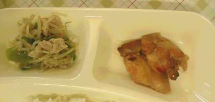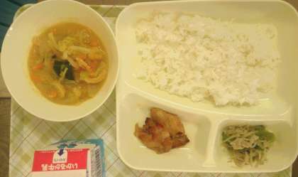 今日の給食は、鶏肉のてり焼き、みそ汁、野菜いため、ごはん、牛乳です。
