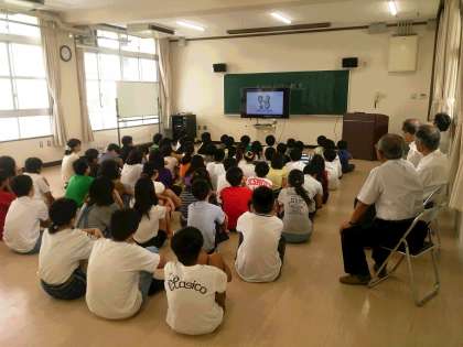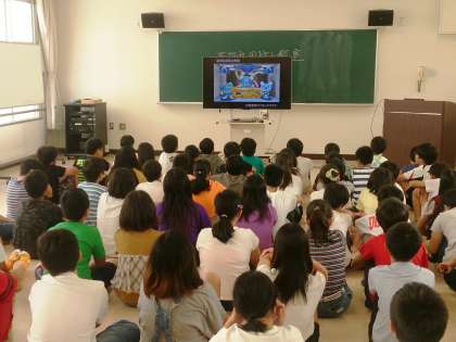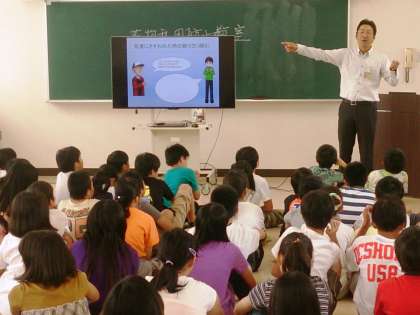 6年生の「薬物乱用防止教室」で、薬の正しい使い方を学習しています。子どもたちは、真剣に講師の先生のお話を聞いています。