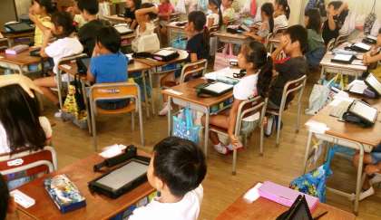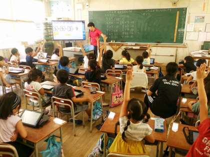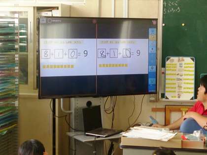 1年生の算数では、「こたえが9、10になるしきをつくろう」という学習に取り組んでいます。タブレットに書き込んで、その式を大型液晶テレビに映して発表しています。