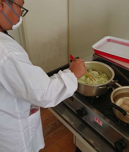 調理実習でロールサンドをつくりました。卵をゆでたり、野菜を切ったり、みんなで協力しながら作ることができました。