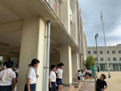 6年生は初めて運動場に出て位置の確認を行いました。休憩中はピロティに取り付けたミストシャワーにかかりながら、体調を見ながら進めていました。