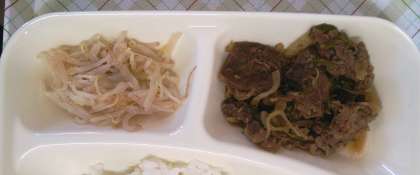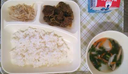 今日の給食は、プルコギ、トック、もやしの甘酢和え、ごはん、牛乳です。