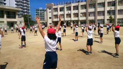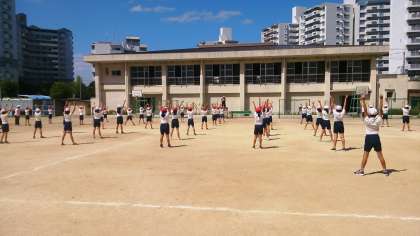 4年生の体育では、運動会の団体演技の練習に取り組んでいます。テンポの速い曲に、振りをみんなで合わせています。隊形移動も、頑張っています。