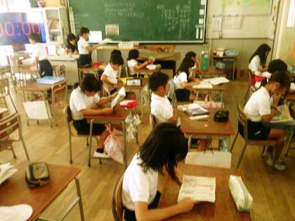 3年生の国語では、単元のまとめのテストに取り組んでいます。テストが終わった子どもたちは、静かに読書しています。