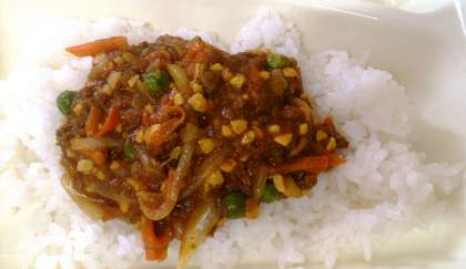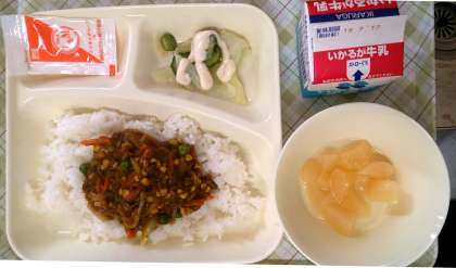 今日の給食は、大豆入りキーマカレーライス、グリーンサラダ、白桃、牛乳です。