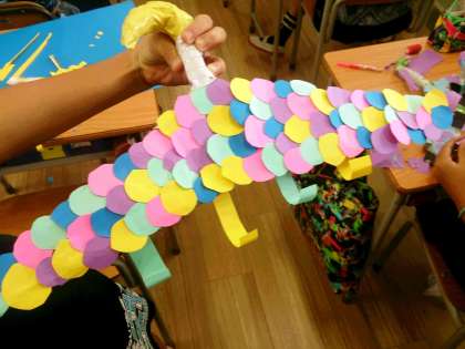 4年生の図工では、「ふしぎな鳥」の作品作りに取り組んでいます。ハンガーに紙を巻き付け、鳥を作っています。写真のように、作品には、子どもたち一人一人の創意工夫がみられます。