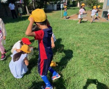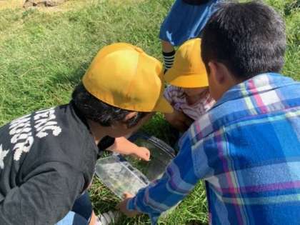 1年生は生活科「いきものとなかよし」の学習のために、運動場に出てバッタを探していました。運動場も広く、芝生も広がっているため、たくさんのバッタや蝶々などの生き物を見つけることが出来ました。