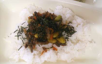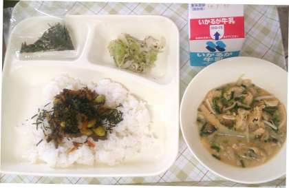 今日の給食は、牛肉のきんぴらちらし、みそ汁、キャベツの赤じそあえ、牛乳です。