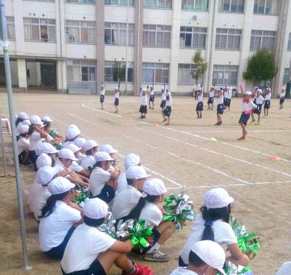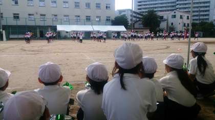 1・2年生の体育で、運動会の団体演技を相互に見学しています。写真は、1年生の団体演技を2年生が見学している様子です。