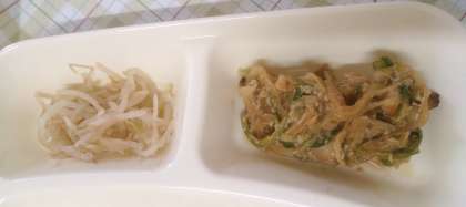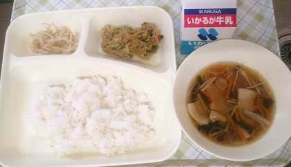 今日の給食は、鶏肉のごまだれ焼き、ソーキ汁、もやしのしょうがじょうゆあえ、ごはん、牛乳です。