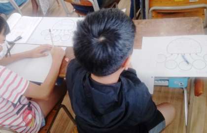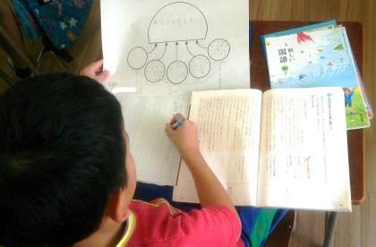 4年生の国語では、「自分の考えを文章に書こう」の学習で、作文に取り組んでいます。図を使って、テーマや自分の考えを整理して、作文を書いています。